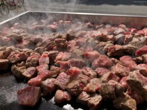 焼きたての「サイコロステーキ」と、筑前町で採れた「あまおう苺」をご用意。